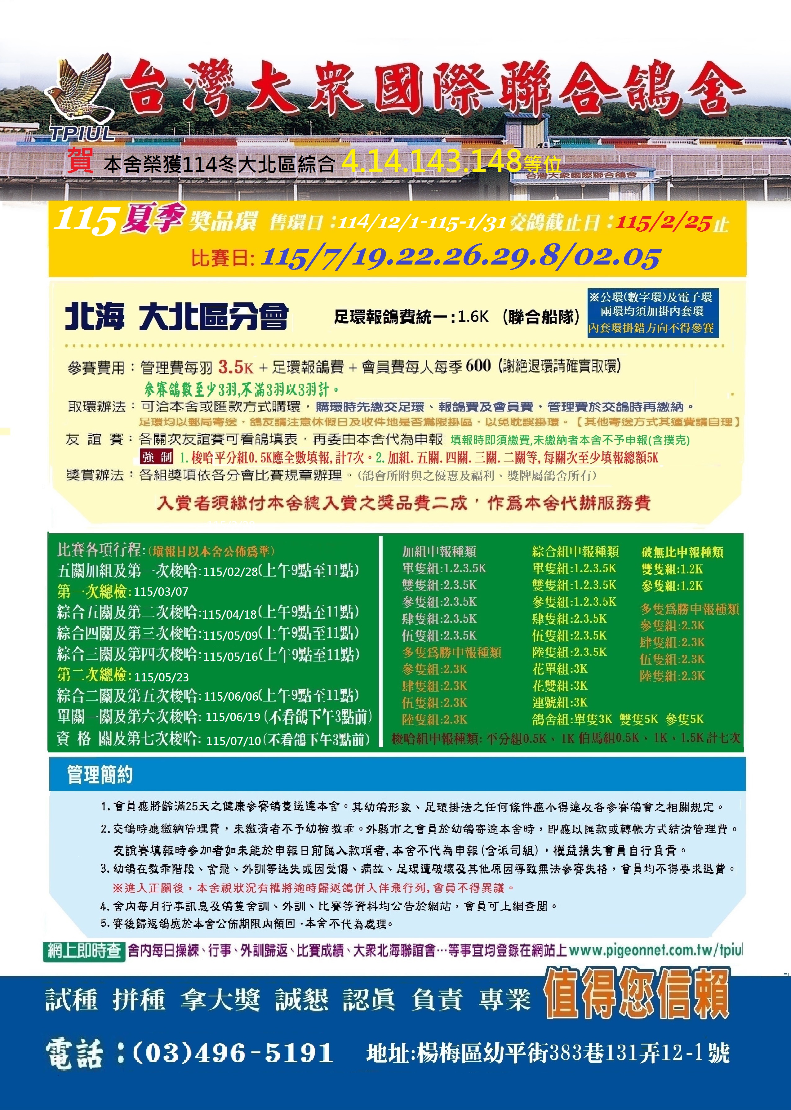 | 114冬大北區賽後鴿領回:即日起至12/20日止.入等鴿拍照後始可領回 | 2025-12-11 12:30 |